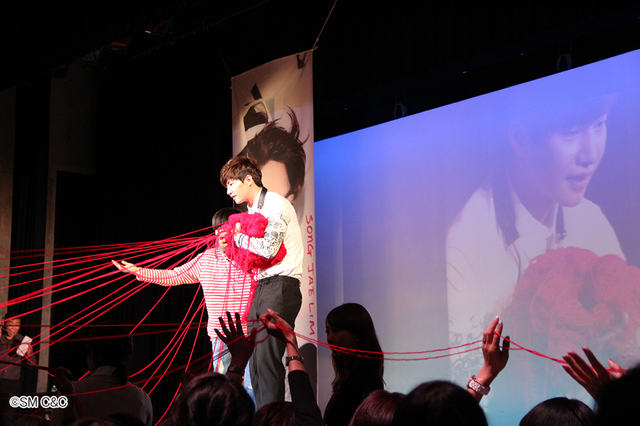 イベント終盤には、韓国の詩人キム・チュンスの「花」という詩とともに、彼が日本のファンのために書いてきた直筆の手紙を涙で声を詰まらせながら朗読。ファンたちの「ファイティン~」という温かい声援に支えられながら読み終えると、中島みゆきの『糸』の熱唱でエンディング。歌の間に客席の前から後ろに向かって赤い毛糸が手渡されて行き、最後には会場全体がステージ上のソン・ジェリムと赤い糸でつながったファンミーティングとなった。