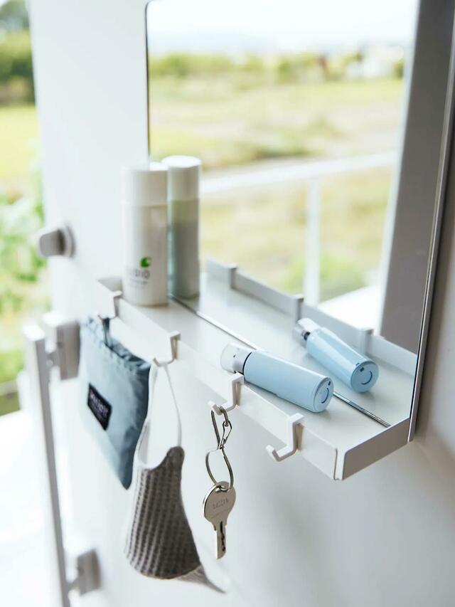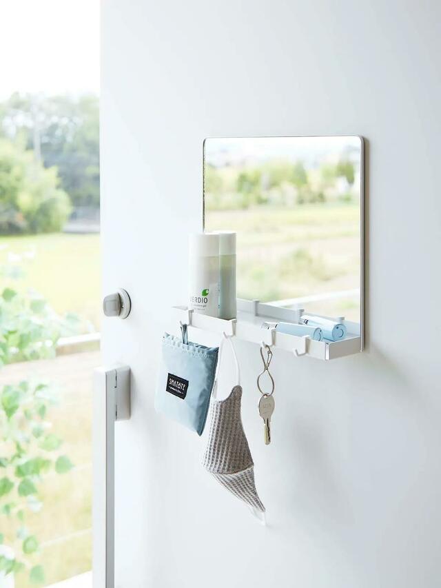 外出に必要なものをまとめて置けて、身だしなみチェックまでできるという、ありそうでなかったアイテムが山崎実業から登場しました。