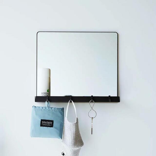 鏡のフレームには、内寸の奥行き約5.8cmのちょっとしたラックと、4つのフックも。