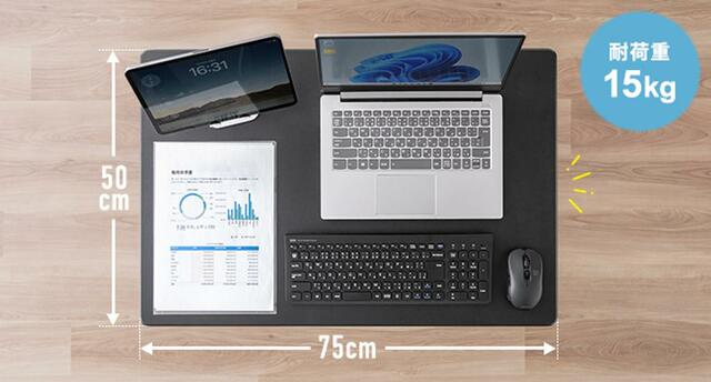 天板サイズは幅75×奥行50cmと広め。ノートPCを置いても、周囲に十分な作業スペースを確保できます。