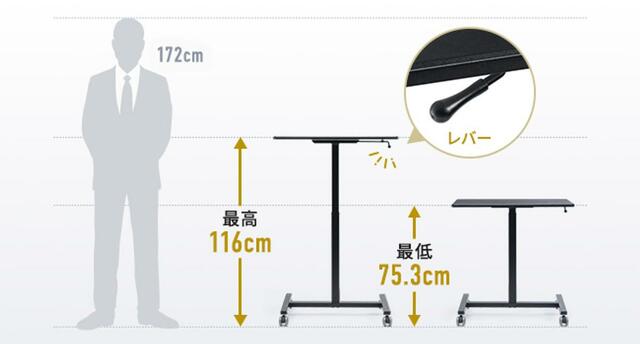 天板の高さを無段階で変えられるので、使う人の身長や腰の高さ、姿勢に合わせた調整が可能です。