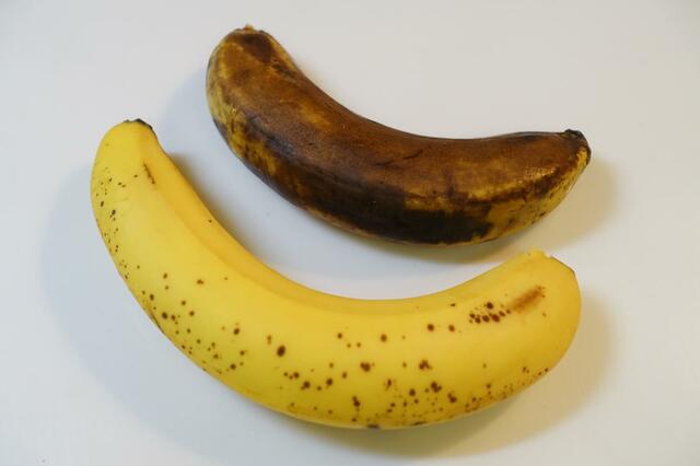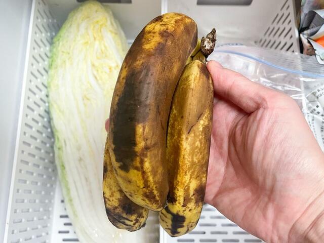 5日後、2つのバナナを比べてみると、冷蔵庫で保管していたバナナはいつも通りに黒く変色していました。
