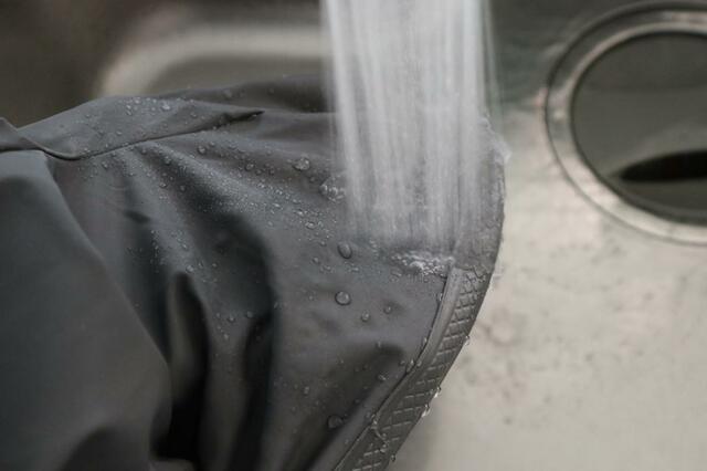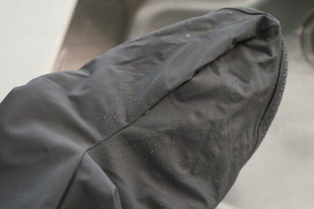 素材は塩化ビニル樹脂で、はっ水加工が施されているそうなんですが、これがもう水を弾く弾く!