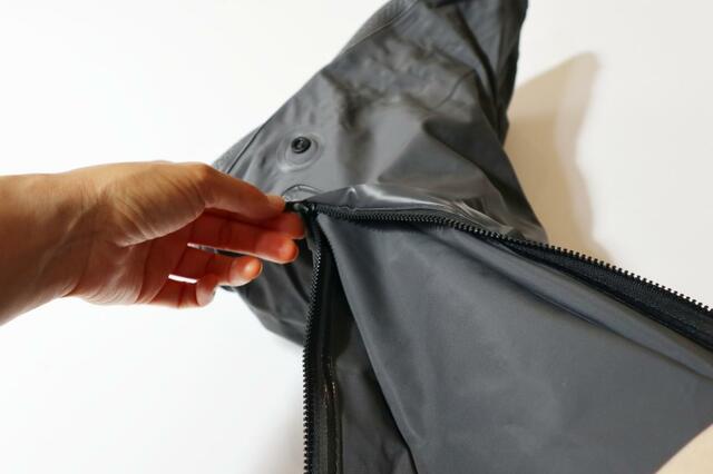 サイドジップ仕様で、着脱もすごくカンタン。ジップ部分は生地が二重になっているので、雨が染み込むこともなさそう。