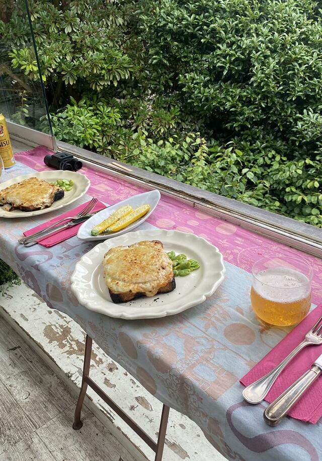 クロックムッシュ、焼きズッキーニ、ビール、ガリガリ君系パイン君とソーダ君。