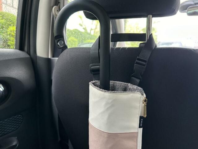 濡れた傘で自家用車が汚れるのが気になる人には、この傘ケースのストラップを運転席か助手席のヘッドレストに吊り下げて、後部座席の正面に傘ケースがくる格好で設置するのがオススメです。