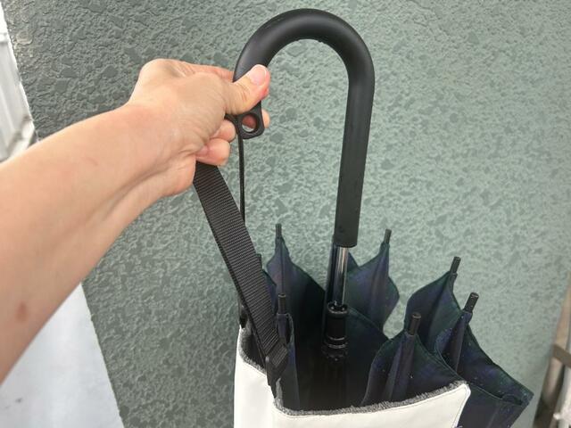 肩にかけて持ち運べば、電車やバス、店内を雨水で濡らさなくてすむよ