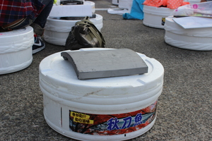 魚河岸らしい秋刀魚が入っていた容器も。その上にあるのは瓦。これも楽器。