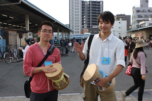 日本の伝統楽器小鼓を模した紙ドラム」 。全て紙で出来ていて、紐を握ることで音程も変わる。