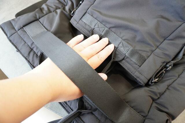 また、ユーティリティバッグの方は裏側にスーツケースに通せるベルトがあるのに対し、ミニバッグの方はベルトがありません。