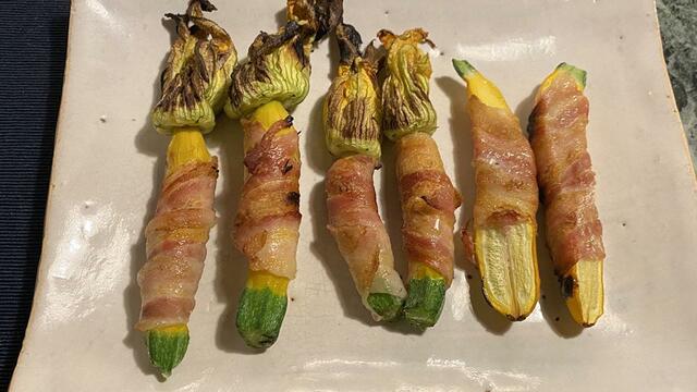 花ズッキーニの豚バラ肉巻き焼き。これも超簡単。超簡単で美味しい夕食でした。雨降りは続く。