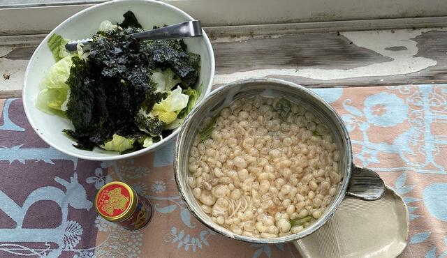 韓国海苔どっさりのレタスサラダ。ゴマ油(太香)をたらり。昨日よりさらに美味しくなった。