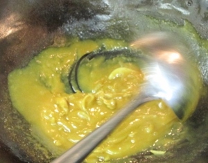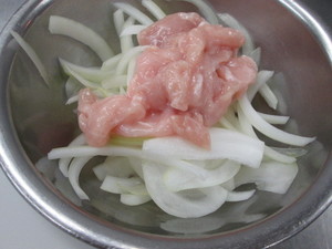 排骨を揚げている間に、油通しした豚肉とタマネギをサッと炒め、カレー粉などの調味料を加えてよくかき混ぜ、全体が馴染んでトロミがついたら出来上がり。
