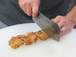 カラッと揚がった排骨を食べやすい大きさにカット。サクッサクッといい音~。