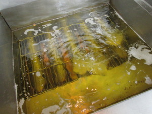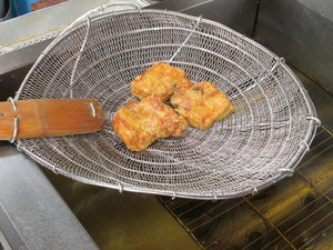 まずは排骨を油に投入。生の骨付き肉なので、7~8分かけてじっくりと揚げる。