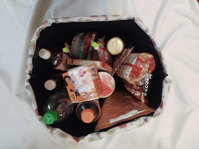 食品もたっぷり入るバッグは、レジカゴにすっぽり入るくらいの大きさ。物を入れるときや、バッグをレジカゴにセットする際は、上蓋部分を裏返して使用するとスムーズです。