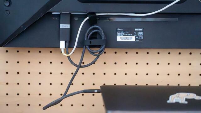 せっかくミニマルにデスク周りを整えられるアイテムなので、余ったケーブルはモニター裏に固定してスッキリ見せるように工夫しています。