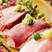 ローストビーフに使用しているお肉は、赤身のモモ肉。お皿の上に山盛りのローストビーフをのせ、ビニール手袋を着用した状態で、宣言した量をつかみます。