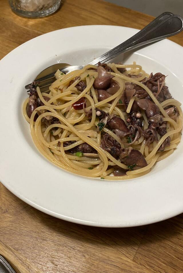 食べたのはクロダイのマリネとホタルイカのスパゲッティ。私だけ白ワインを飲みました。TORUくんは運転手なので、ペリエ。