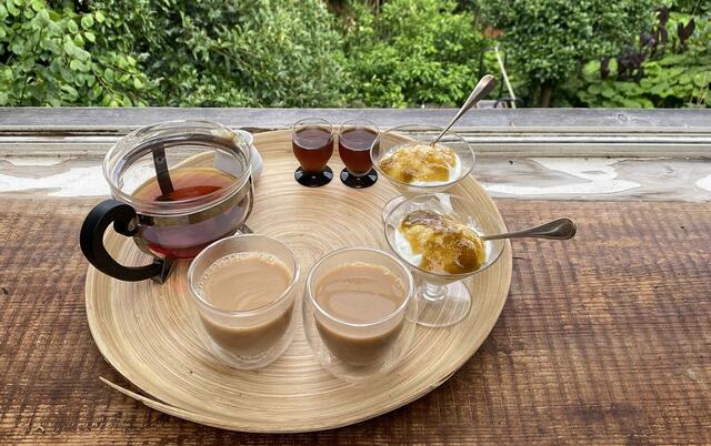 ミルクティ、本日の元気、梅ジャムヨーグルト。チッ、今日も曇天に逆戻り。