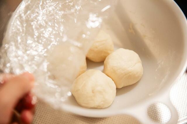 ③4等分して生地を丸める。ラップをかけて室温で約10分寝かせる