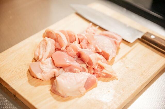 ①鶏もも肉をひと口大にカット