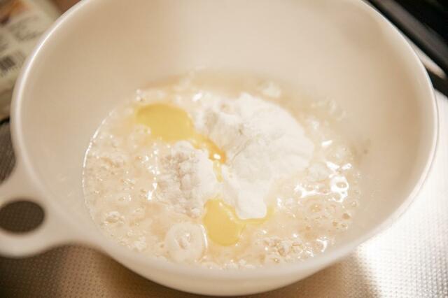まずは「ナンミックス」をボウルに全て出し、水を100ml、サラダ油(またはオリーブオイル)を小さじ1杯程度加えます。