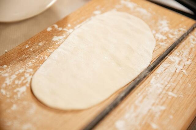 ④まな板の上に生地を載せ、長さ25〜28cmの楕円状に