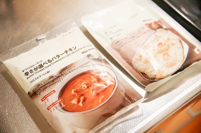 無印良品 「手づくりカレーキット 辛さが選べるバターチキン」450円、「フライパンでつくる ナン」 190円(各税込)