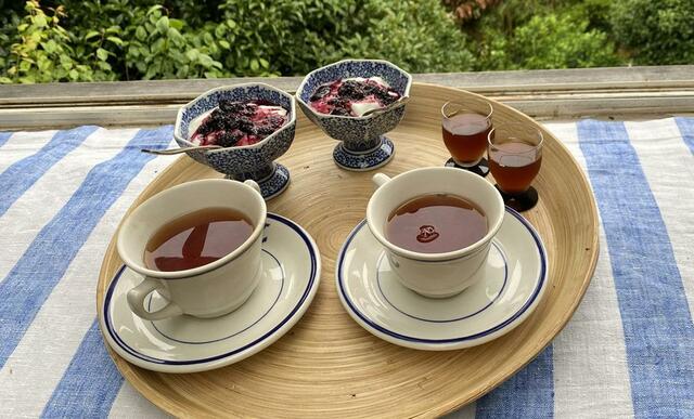 雨、強い雨。がっかり。ミルクティ、本日の元気、昨日いただいた半沢マリさん作の「桑の実ジャム」をヨーグルトにのせて。ジャム、美味しい。上品な美味しさ。ごちそうさま!