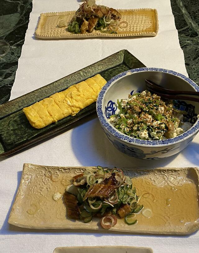 しばらく和食を食べていないかも。ウナギが食べたい。SUZUKIYA製のうなぎを買って、まずはうざく(うなぎときゅうり)、豆腐と三つ葉とザーサイmix、ふんわりした出し巻き卵、