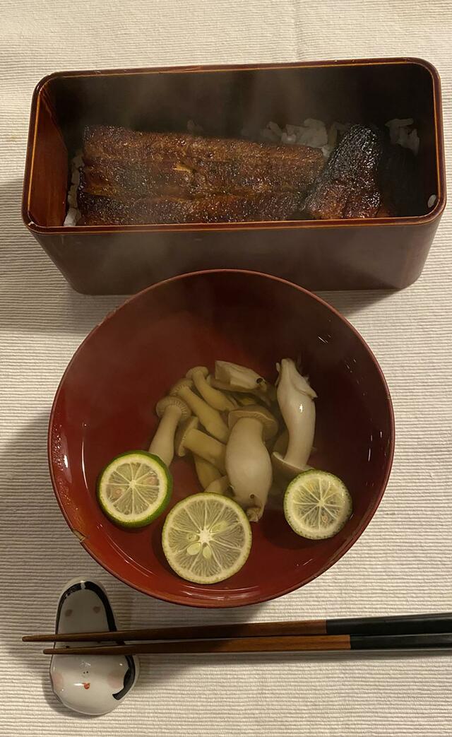 うなぎの蒲焼(重)、しめじとスダチのお吸い物。うざくのうなぎも焼くべきだった。反省。
