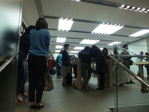 渋谷のApple Storeに着くと、平日の夜にもかかわらず店内には大勢の人が! 当然ながら、Genius Barも満席です。予約時間になり、さっそくスタッフの方に状況を説明すると、簡単な同意書を書いてすぐに修理をしてもらう運びとなりました。どうやらiPhoneのディスプレイを破損して訪れる人は多いようで、スタッフの対応も手馴れていて安心感があります。