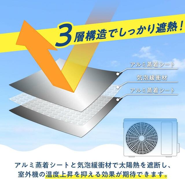 アルミ蒸着シートと気泡緩衝材を組み合わせていることで、太陽光を反射し、熱が室外機に伝わるのを抑えることができます。