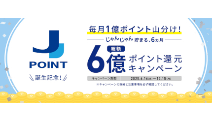 新ポイントの誕生を記念して「<J-POINT誕生記念!>総額6億ポイント還元キャンペーン~毎月1億ポイント山分け!じゃんじゃん貯まる、6カ月~」を6月16日から12月15日まで開催する。