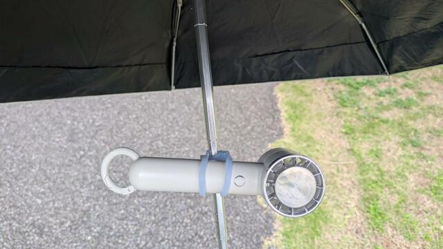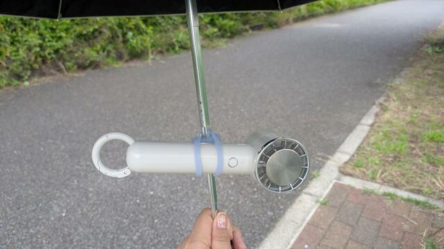傘に付けられるクリップ型のアンブレラファンもありますが、今回は手持ちのハンディファンを無駄にしないために、そのまま使える方法を試すことにしました。