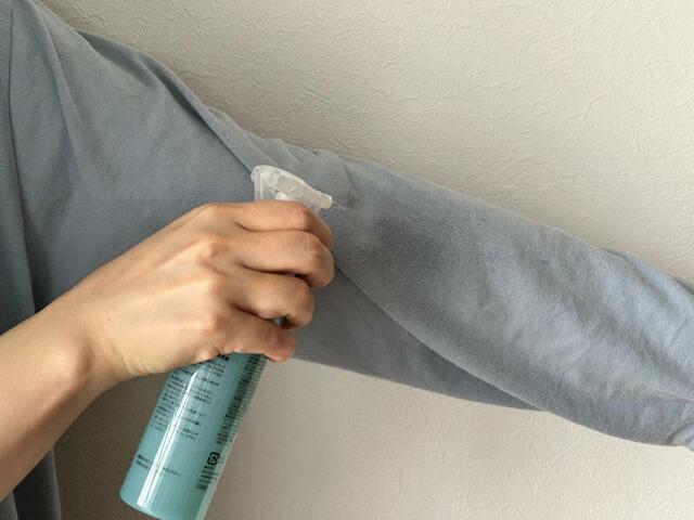 続いてもう片方の腕には、「服の上から使う ひんやりミスト」を吹きかけます。