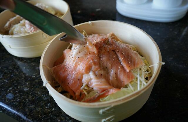 私はクッキングシートの代わりにキャベツを敷いて蒸すこともあります。