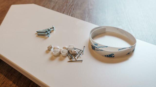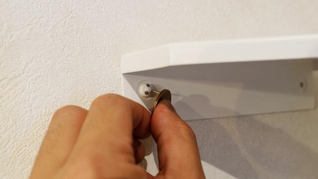 今回は、リビングのエアコン下にあるデッドスペースに取り付けてみることに。壁に跡が残りにくい石こうボードピンを利用しました。ちなみに、ピンとネジは付属しています。