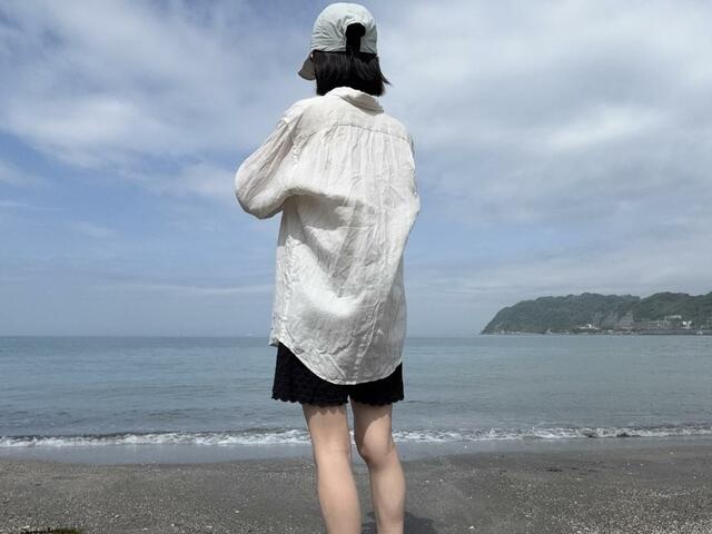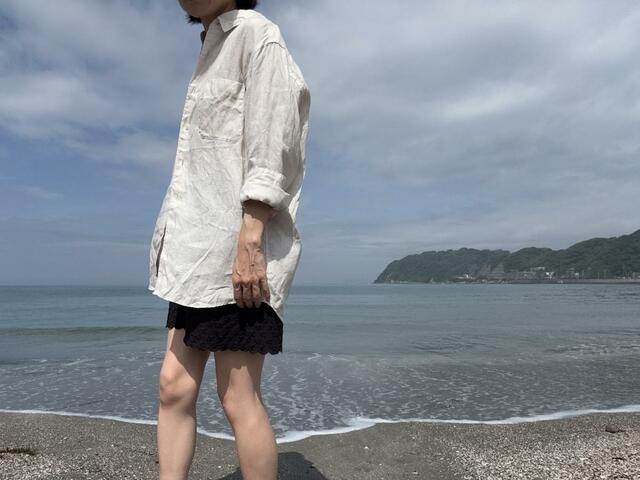 タンクトップにショートパンツと大人にはちょっと心許ないコーディネートも、リネンシャツを羽織るだけで安心感。
