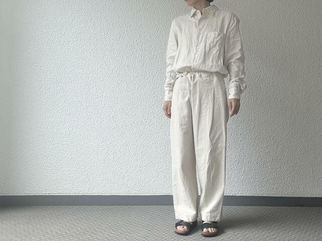 ウィメンズとメンズではシルエットのほか生地感も異なり、ウィメンズはやわらかく織り上げているのに対し、メンズのほうがざっくりとした麻感を感じます。
