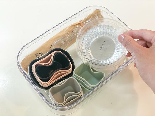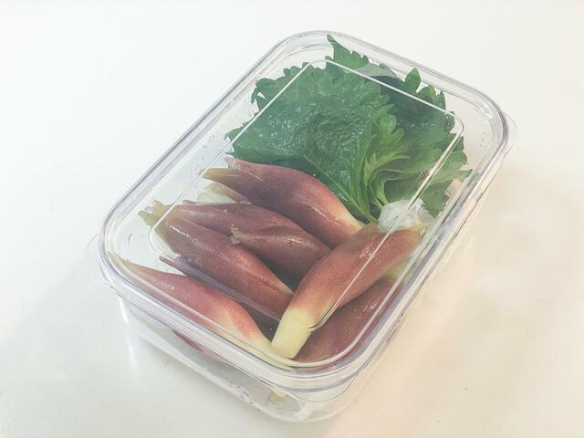 こちらは、わさわさと元気な葉物野菜を入れたりしていたのですが、ふと思い立って「お弁当グッズ」の収納ケースに。これが、思いのほかフィットしてくれました。