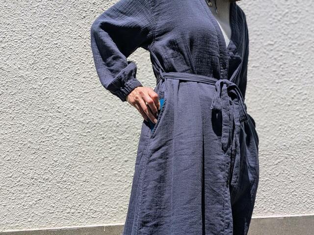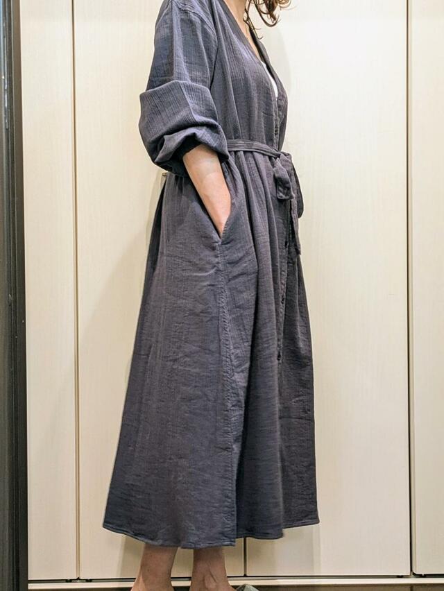 ボタンを留めればワンピース風にも着られるデザイン。共布のベルトで絞れば、シルエットの変化も楽しめます。