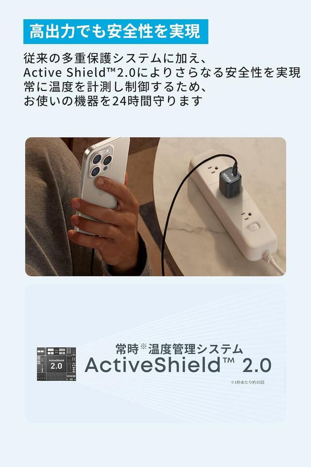 「Zolo Charger (30W))」にはAnker独自の多重保護システムに加え、「Active Shield️2.0」技術を搭載。24時間体制で温度を監視・制御し、過充電や発熱から接続機器をしっかりと守ってくれます。