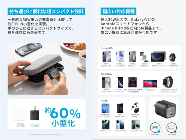 一般的な30W出力の充電器と比較して約60%も小型化されており、カバンやポケットに入れても邪魔になりにくいサイズ感です。