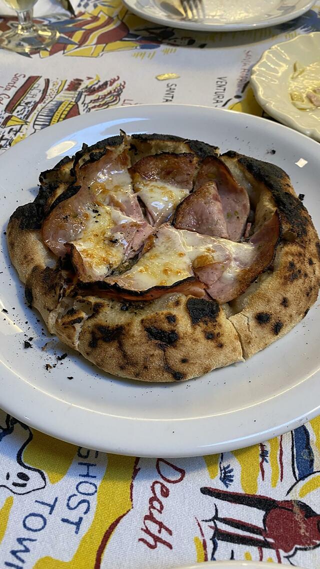 一昨日、竹内さんからいただいてきたハムのPizzaを窯の中でさっと焼いて。