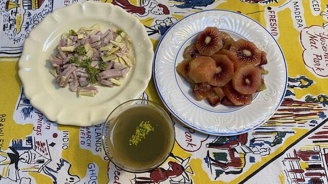 伊:カルチョフィ(英:アーティチョーク)(仏:アーティショー)の芯部分(台座のような部分)をスライスしてレモン汁をかける。スライスしたハムと混ぜる。塩とオリーブオイルをかける。これで完成する「カルチョフィのサラダ」、トマトエキス、赤いキウイ(グリーンの方が見た目も味も好きだな、私)。今夜はPizza中心のお夕飯。