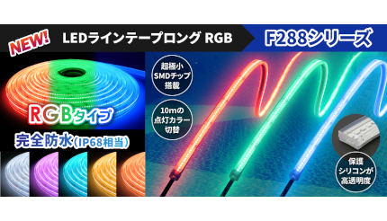 同社は2024年5月から、標準的な単色タイプの「LEDラインテープロングF308」シリーズでのみ、防水とサウナ防水を販売している。今回、「LEDラインテープロングF308」シリーズと同一のLEDテープで、点灯カラーを切り替えられるものがほしいという要望が多く寄せられたことから、「LEDラインテープロングF288 RGB水中・サウナ防水」の開発に至った。