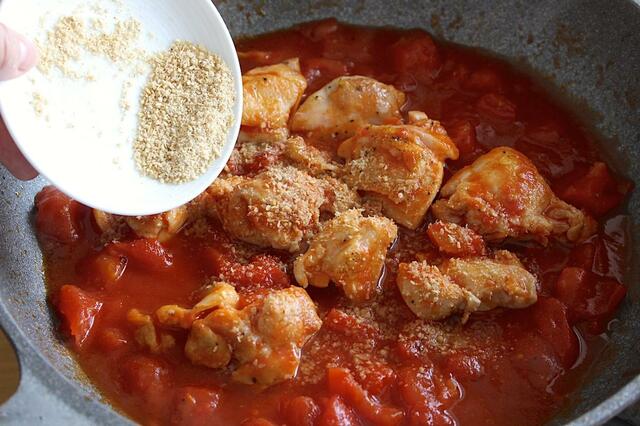 カットした鶏もも肉を塩コショウし、トマト缶・酒・砂糖・おろしニンニクで炒め煮にして、最後に軽くすりゴマを加える……これ、本当にイケるんです。