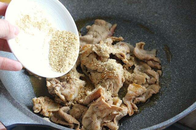 たとえば安く買える豚こま肉を塩コショウし、醤油・酒・みりん・砂糖で甘辛く炒めて最後にすりゴマとあえれば、味も香りもバッチリまとまります。